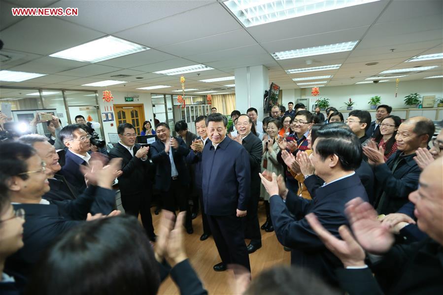 BEIJING, Feb. 19, 2016-- Chinese President Xi Jinping (C) talks with editors at the general newsroom of the People's Daily in Beijing, capital of China, on Feb. 19, 2016. Xi on Friday visited the People's Daily, Xinhua News Agency and China Central Television, the nation's three leading news providers. (Xinhua/Lan Hongguang)