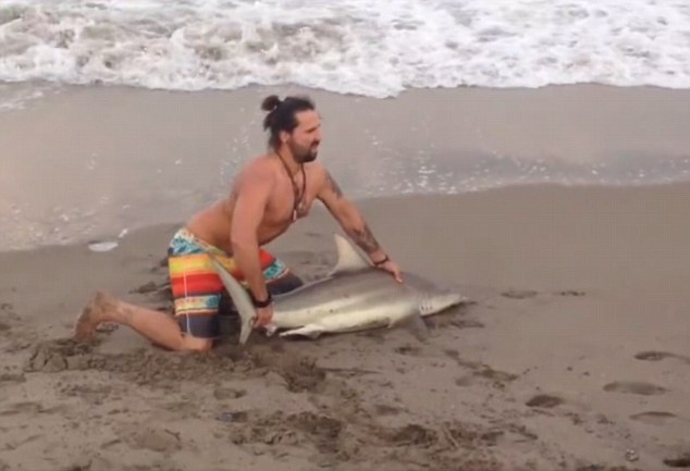 The man pins the struggling creature down for at least a minute while posing for the cameras, before eventually returning the shark to the water