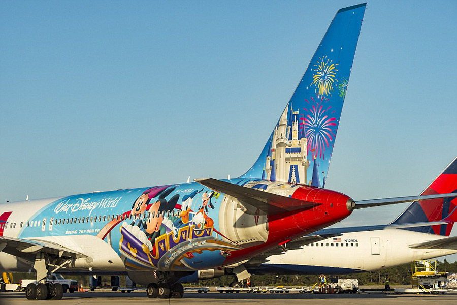 The exterior of the airplane shows the magic and fantasy of Walt Disney World and portrays the characters having fun on a roller coaster.