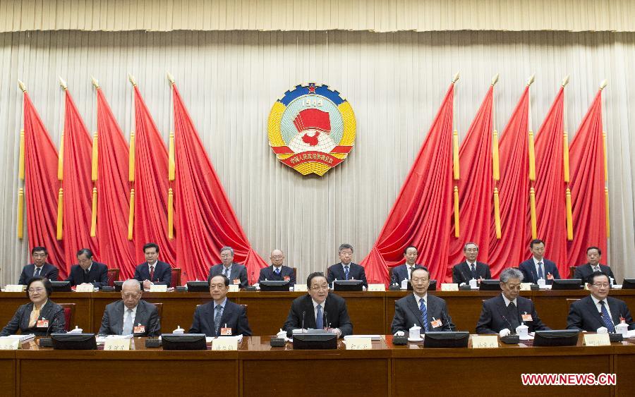 Yu Zhengsheng (C front), Chairman of the National Committee of the Chinese People's Political Consultative Conference (CPPCC), presides over the opening meeting of the 9th session of the Standing Committee of the 12th CPPCC National Committee in Beijing, capital of China on Feb. 27, 2015. [Photo: Xinhua]