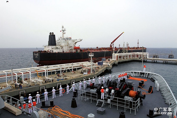 The "Weishanhu" supply ship of the 14th escort taskforce of the Chinese People's Liberation Army Navy arrives in the Port of Djibouti of the Republic of Djibouti on the afternoon of June 6, 2013, local time, beginning its 3-day-long replenishment and recuperation. (Photo/CNR)