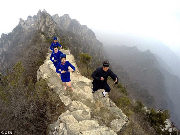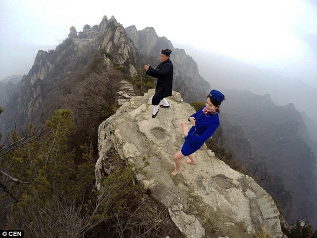 Stunning and bizarre photos from China have revealed the latest training and promotional techniques of aviation schools as a group of flight attendants performed martial arts on a mountain top.