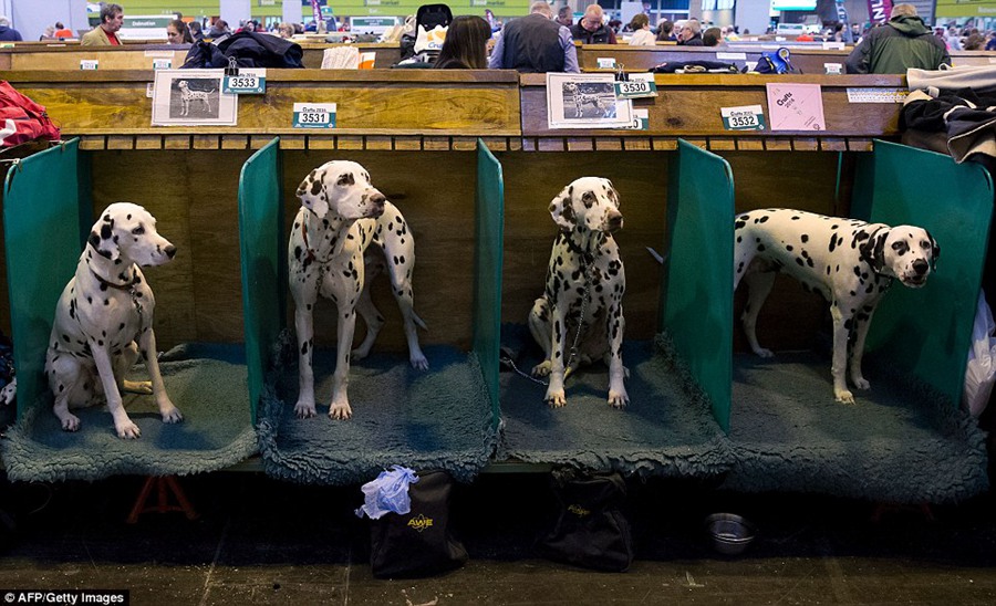Dalmations sit in their stalls on the first day of the Crufts dog show at the National Exhibition Centre in Birmingham