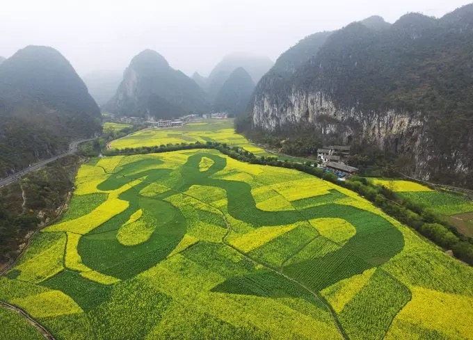 As days get warmer, rapeseed flowers bloom into sea across China. Photos taken on March 12, 2016 show a giant Chinese character meaning “dragon” (龍) drawn in an 80,000-square-meter rapeseed flower field in Anshui, southwest China’s Guizhou province.