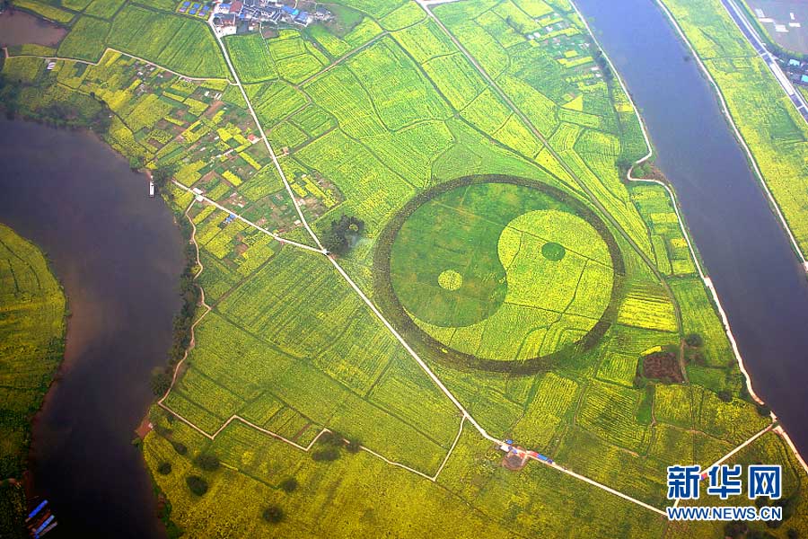 Drone photos show rapeseed flowers terrace in the shape of a Taiji symbol