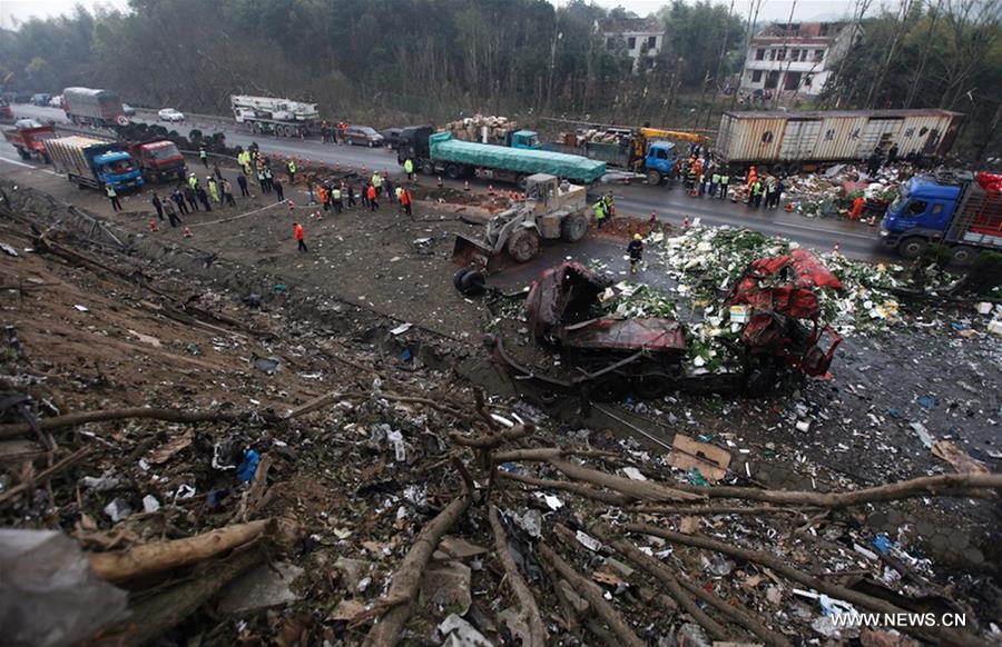 Photo taken on March 20, 2016 shows the explosion site on a section of the highway linking Beijing to Hong Kong and Macao, in Yueyang City, central China's Hunan Province. Five people died and twenty others were injured after a truck exploded on the highway on Saturday, according to local authorities. [Photo: Xinhua/Zhou Min]