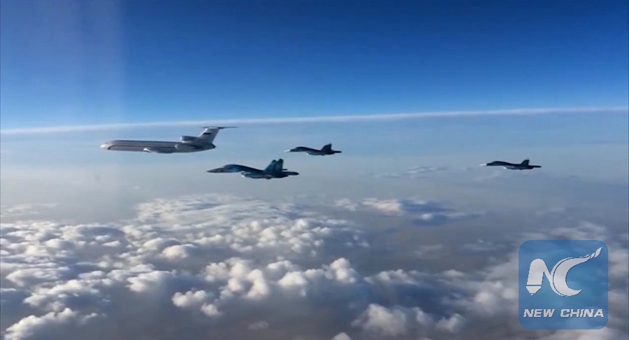A screenshot taken from a Russian Defense Ministry video shows the first group of Russian Aerospace Force aircraft heading back to Russia from Syria, on March 15, 2016 (Xinhua/Sputnik)