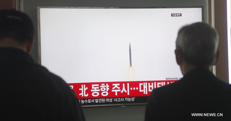 South Koreans watch a report of short-range projectiles fired by the Democratic People's Republic of Korea (DPRK) at Seoul railway station in Seoul, capital of South Korea, on March 21, 2016. The Democratic People's Republic of Korea (DPRK) on Monday fired a total of five short-range projectiles into its eastern waters in an apparent show of force toward the ongoing U.S.-South Korea joint military exercises. (Xinhua/Yao Qilin)