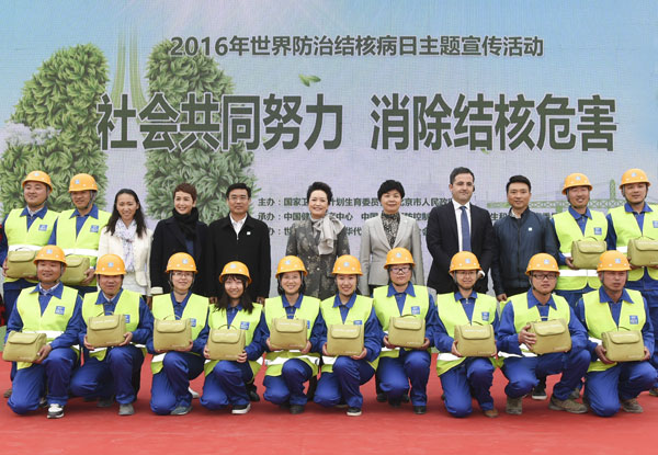 Peng Liyuan (C), China's first lady and the World Health Organization's goodwill ambassador for tuberculosis and HIV/AIDS, attends an event to raise awareness, in Beijing on March 22, 2016, ahead of World Tuberculosis Day that is marked on March 24 each year. [Photo/nhfpc.gov.cn]