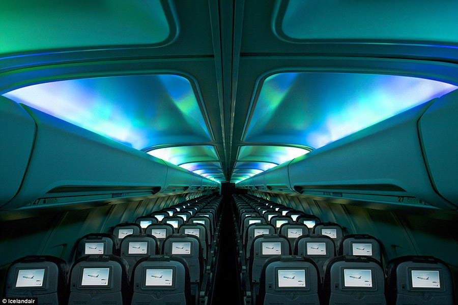 A one-of-a-kind LED mood lighting system inside the Boeing 757's main cabin recreates the display of the Aurora Borealis.