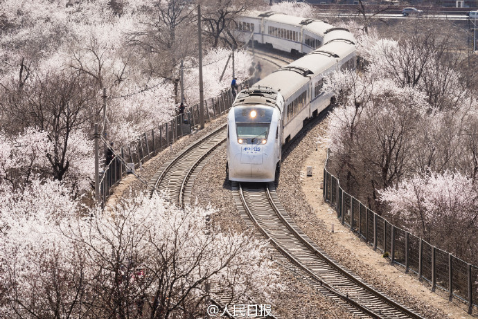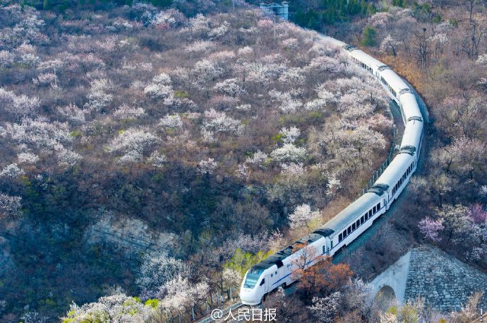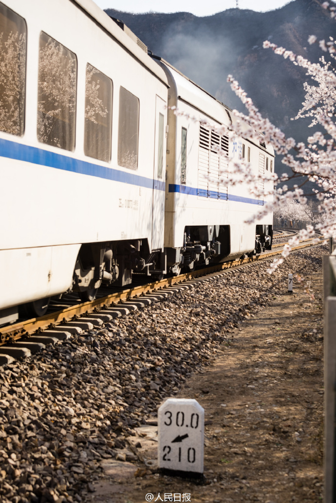 Photos showing a train running through a field of flowers near the Juyongguan Pass of the Great Wall in Beijing recently went viral online. Since the photos have become so popular, many photographers have come to Juyongguan Pass to capture the beautiful spring scenery. However, the best shooting location — the mountain road — has been temporarily closed.