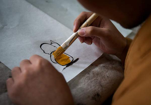 Master Xianfan draws cartoon image of Xian'er in Longquan Temple in Beijing, Sept 27, 2015. [Photo/Xinhua]