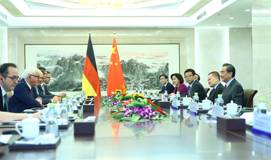Chinese Foreign Minister Wang Yi talks with his German counterpart Frank-Walter Steinmeier during the second China-Germany strategic dialog on diplomatic and security issues in Beijing, China, April 8, 2016.