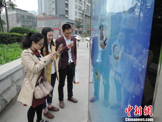 Pedestrians watch videos with the Wi-Fi provided by the street sign. (CNS/Han Zhangyun)