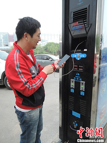 A pedestrian surfs the Internet with the free Wi-Fi while he charges his phone. (CNS/Han Zhangyun)