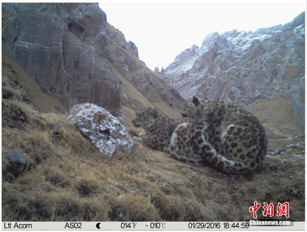 Wildlife monitors from the Beijing Shanshui Nature Conservation Center have captured on video for the first time the courtship and mating rituals of snow leopards.