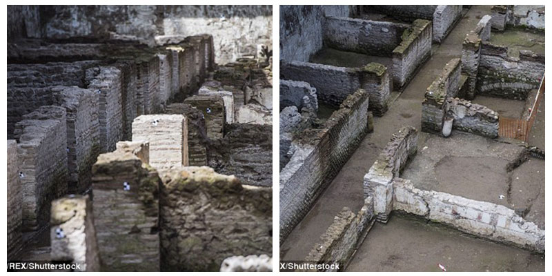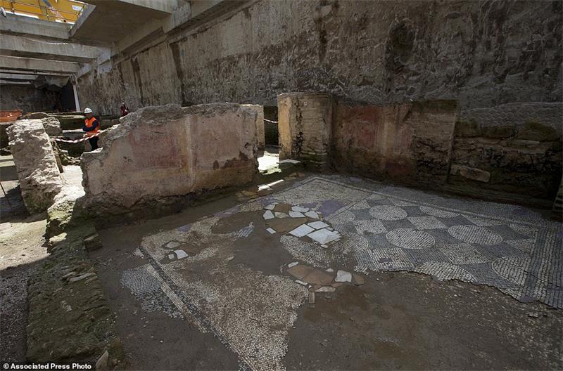 The barracks, discovered nine meters (about 30 feet) below street level, cover 900 square meters (9600 square feet) and include a long hallway and 39 rooms decorated with black-and-white mosaics on the floors and frescoed walls. A view of ancient Roman ruins is pictured above (AP Photo/Alessandra Tarantino)