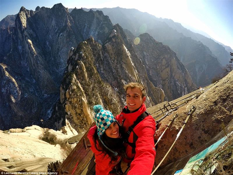 The nail-biting snaps show Leonardo Pereira and his girlfriend, Victoria Nader, from Brazil, on the edge of Mount Hua, or Huashan, where they walked its infamous ‘plank walk in the sky’.