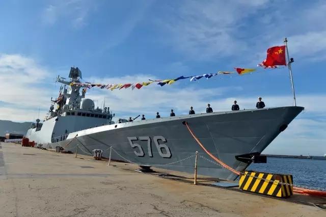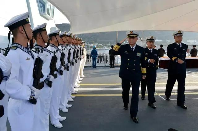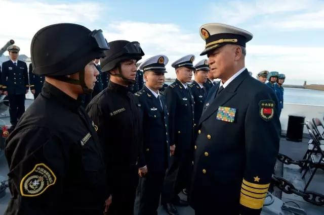 This is the first ever time that a PLA Navy commander has boarded a naval vessel while overseas. On board frigate Daqing, Wu inspected the guard of honor; on the decks of all three vessels, he chatted with officers and soldiers.