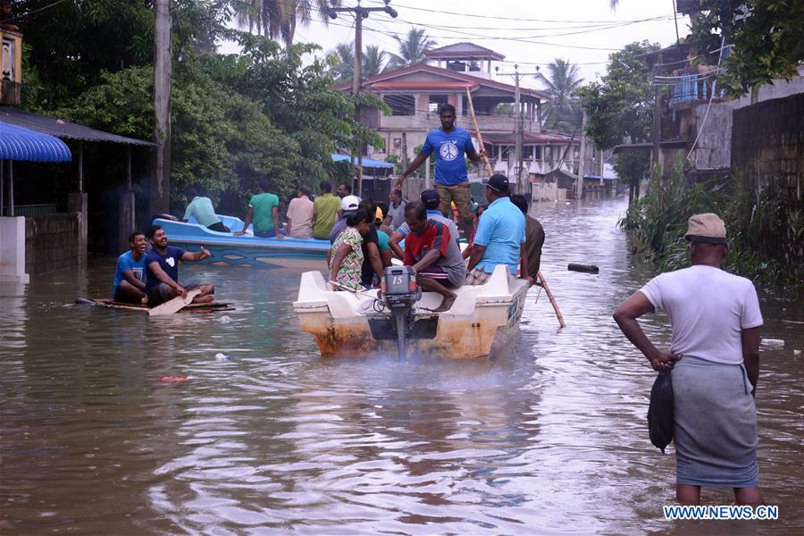People transfer their belongings from houses trapped by flood in Biyagama district, Sri Lanka, on May 19, 2016. The death toll from Sri Lanka's flash floods and landslides rose to 63 on Friday as water levels in many districts continued to rise owing to heavy rains, the Disaster Management Center said. (Xinhua/Gayan Sameera)