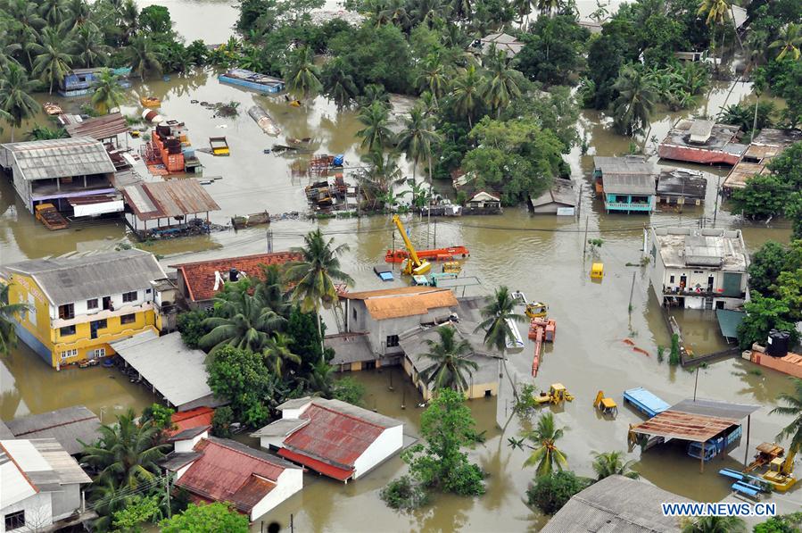 Photo taken on May 19, 2016 shows a bird's-eye view of a flooded village in Kelaniya District, Sri Lanka. The death toll from Sri Lanka's flash floods and landslides rose to 63 on Friday as water levels in many districts continued to rise owing to heavy rains, the Disaster Management Center said. (Xinhua/Ajith Perera)