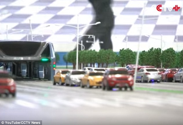 The scale model of the 'Transit Elevated Bus' was demonstrated this week at the 19th China Beijing International High-Tech Expo (pictured). The idea is that passengers sit far above other vehicles on the road, allowing cars to pass underneath