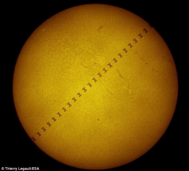 The image here includes frames superimposed on each other to show the Station's path. Mercury appears as a black dot at bottom-centre of the Sun.