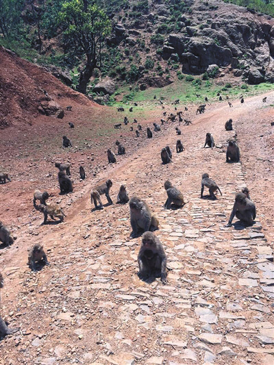 Monkeys wander on the road in Xianfeng Village. (Photo from Weibo)