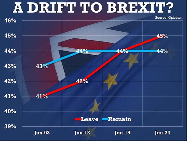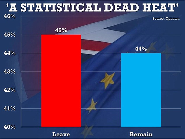 In its final survey, Opinium said after talking to 3,000 people the referendum was a 'statistical dead heat' with Leave on 45 per cent and Remain on 44 per cent - meaning after taking margin of error into account it was impossible to pick a winner