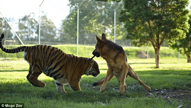 Kinwah (right) the Sumatran Tiger and Rumble (left) the German Shepherd have been playmates for years