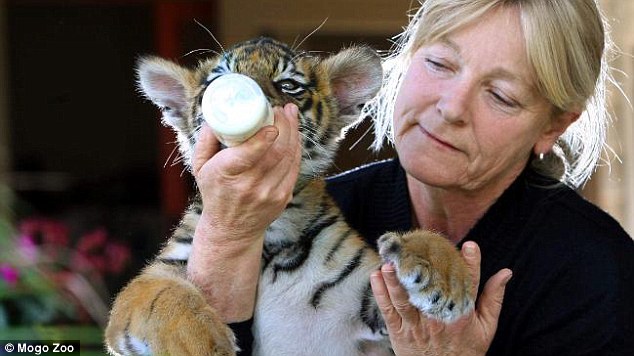 The two met when Kinwah was just a cub, and was hand reared by zoo owner Sally (pictured), who also owns Rumble