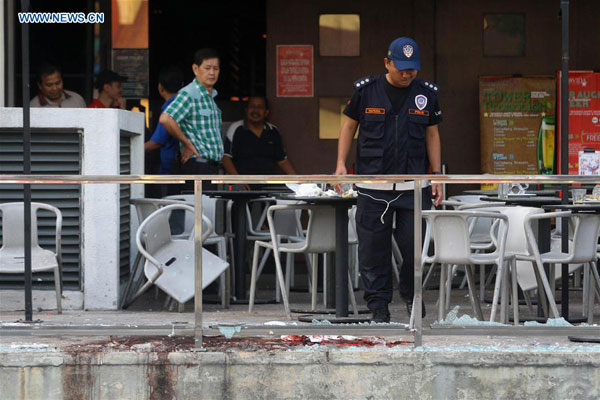 A policeman inspects the scene of an explosion in Puchong, Malaysia, June 28, 2016. [Photo: Xinhua]