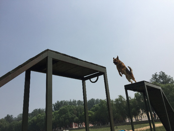 Youyou, a military working dog, runs the obedience course at the MWD training base in Beijing on July 6, 2016. Seven MWD handlers from the MWD training base under the PLA Army carried out a training exercise with their dogs recently in preparation for the International Military Working Dog Competition codenamed "Loyal Partner" to be held in Russia in late July. It will be the first time for the PLA to participate in such a competition. (ChinaMil/Zhang Tao)