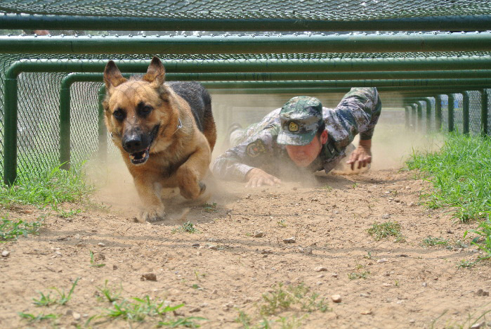 Sergeant Zhou Wenming, a MWD handler, and Tutu (L), a military working dog, crawl through barbed wire together at the MWD training base in Beijing on July 6, 2016. Seven MWD handlers from the MWD training base under the PLA Army carried out a training exercise with their dogs recently in preparation for the International Military Working Dog Competition codenamed "Loyal Partner" to be held in Russia in late July. It will be the first time for the PLA to participate in such a competition. (ChinaMil /Cao Xuan)