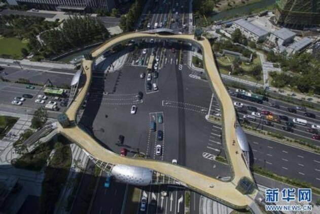 Aerial shots snapped on July 20 show the first ecological footbridge recently devoted into use in ?Hangzhou?, east ?China?’s Zhejiang province. Flower beds are seen arranged at the wider sections of the bridge, and the shell-shaped sheds allow pedestrians to stop for a rest. In addition, the four roadjoints will be later developed into corner gardens. (Photo/Xinhua)