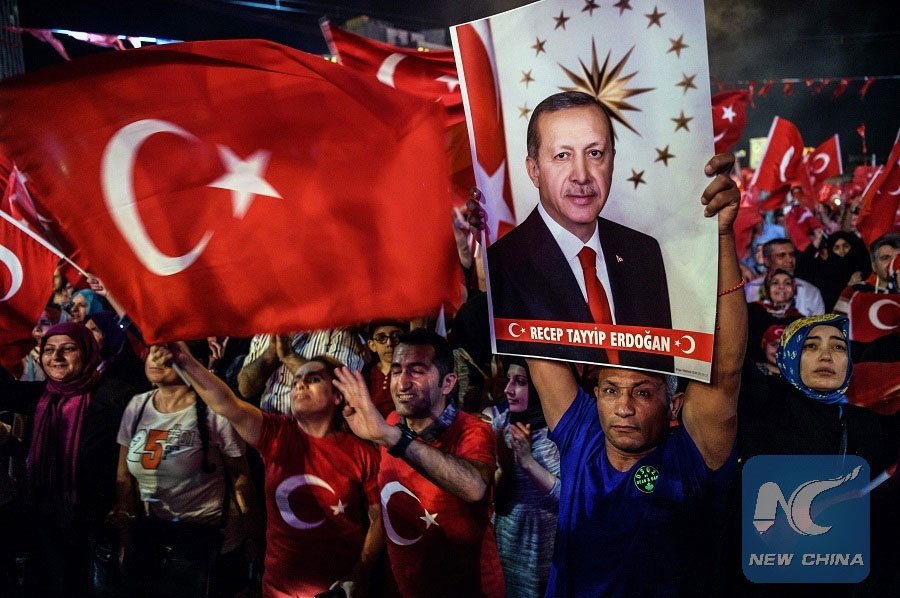Pro-Erdogan supporters hold Turkish national flags and a portrait of Turkish President Recep Tayyip Erdogan during a rally against the military coup on Taksim square in Istanbul on July 23, 2016. (Xinhua/AFP Photo)