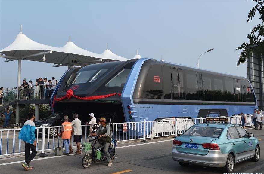 Photos of the futuristic transit elevated bus TEB-1 conducting road test in north China's Qinhuangdao on August 2 have gone viral. The 22-meter-long, 7.8-meter-wide and 4.8-meter-high TEB-1 can carry up to 300 passengers, media reports say.
