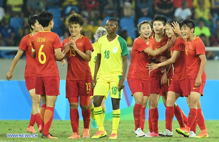 Players of China celebrate after a Group E match of women's football at the 2016 Rio Olympic Games in Rio de Janeiro, Brazil, on Aug. 6, 2016. China defeated South Africa 2-0. (Xinhua/Lui Siu Wai)