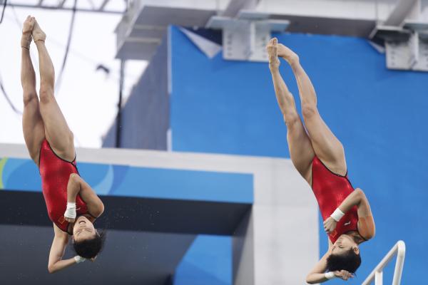 Divers Chen Ruolin and Liu Huixia won the synchronized 10-meter platform dive at the Rio Games on Aug. 9. In doing so, Chen also became the third Chinese athlete with five Olympic gold medals, earning this distinction after Zou Kai and Wu Minxia.
