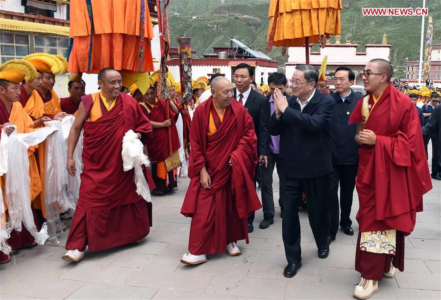 Yu Zhengsheng (2nd R, front), chairman of the National Committee of the Chinese People's Political Consultative Conference (CPPCC), visits Galden Jampaling Monastery in Qamdo, southwest China's Tibet Autonomous Region, Aug. 12, 2016. Yu made an inspection tour in Qamdo from Aug. 12 to 13. (Xinhua/Zhang Duo)