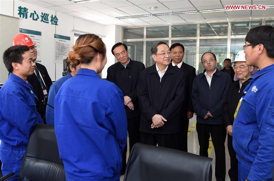 Yu Zhengsheng(C), chairman of the National Committee of the Chinese People's Political Consultative Conference (CPPCC), talks with workers at a substation of State Grid Corporation of China, in Qamdo, southwest China's Tibet Autonomous Region, Aug. 12, 2016. Yu made an inspection tour in Qamdo from Aug. 12 to 13. (Xinhua/Zhang Duo)