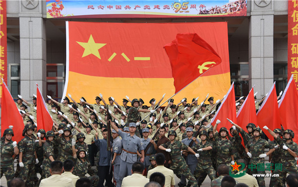 The upper part of the flag features a red background. There is a five-pointed star on the left side, along with the Chinese numerals for “8” and “1,” which symbolize Army Day. The bottom of the flag has a yellow strip to represent fire shooting from a soaring rocket.