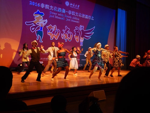 A group of young Chinese performers take to the stage and perform a rendition of Miria Makeba's hit song Malaika, albeit with a touch of drums.