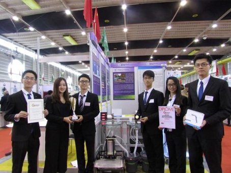 The R&D team show their "air hand-washing device" at the 44th Geneva International Exhibition of Inventions in April 2016.