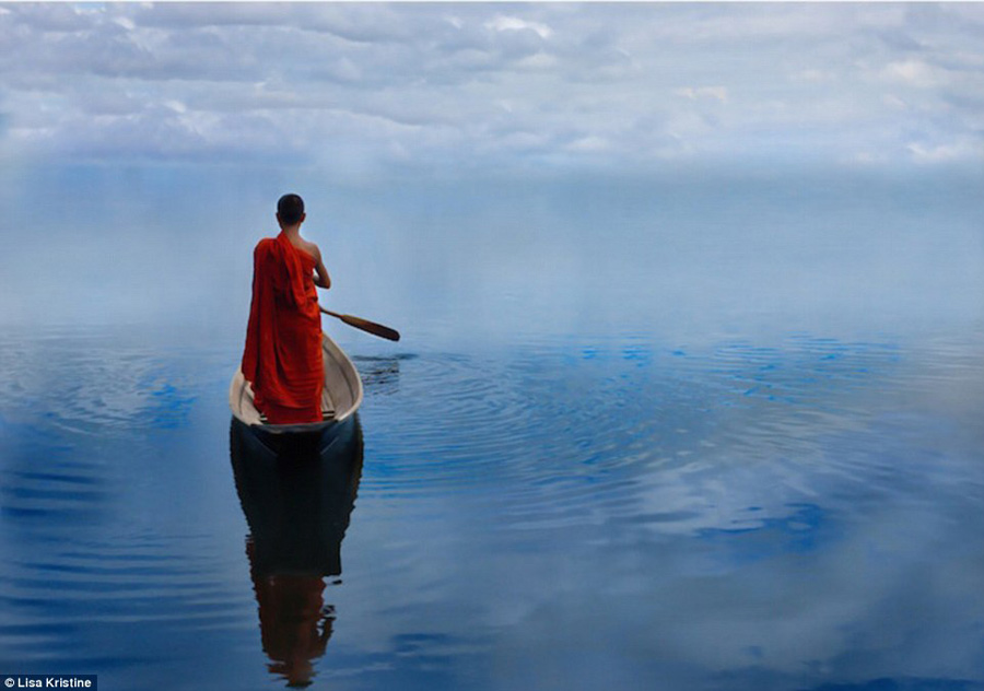 This image taken in Myanmar is entitled 'Eternity' and captures the striking red robes of a monk rowing a boat across a water that blends into the blue of the horizon.