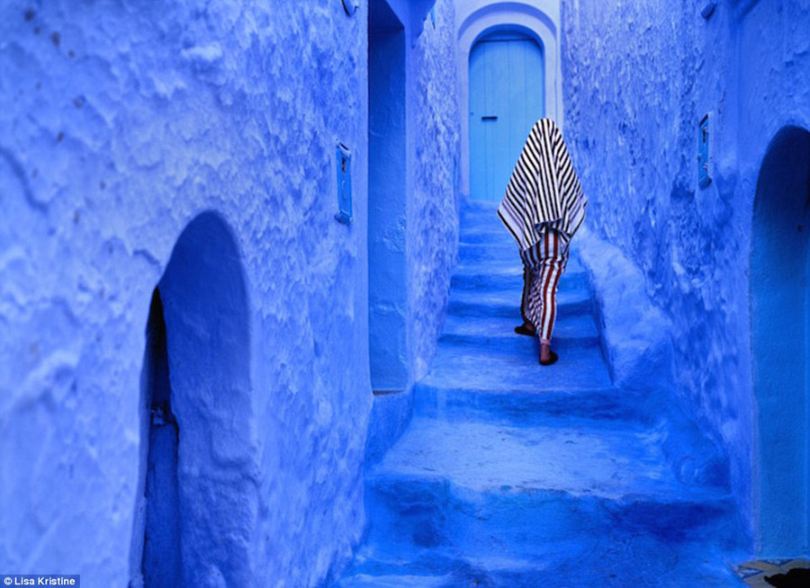 A woman swathed in red and white traditional Berber textile is seen entering her home in the Riff mountains. Moulay Ali Ben Rashid founded this small mountain village called Chefchaouen in 1471. The stunning blue of the dwellings was introduced by the Jews in the 1930’s to replace the whitewashed buildings with green doors and windows that had represented Muslims.