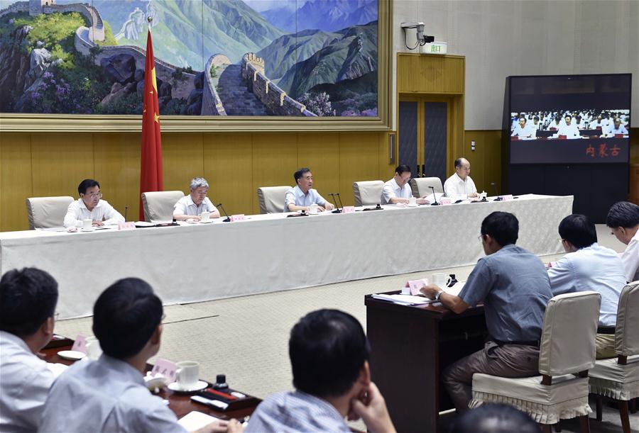 Chinese Vice Premier Wang Yang (C rear) attends a teleconference on poverty alleviation in Beijing, capital of China, Aug. 25, 2016. (Xinhua/Gao Jie)
