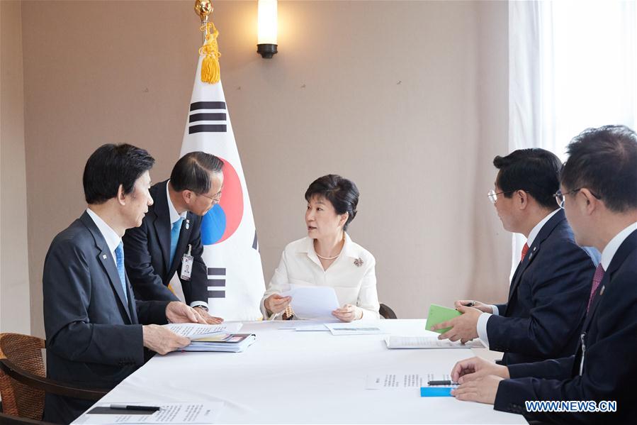 South Korean President Park Geun-hye (C) holds an emergency meeting in Vientiane, Laos, Sept. 9, 2016. South Korean President Park Geun-hye denounced the Democratic People's Republic of Korea (DPRK)'s fifth nuclear test during her trip to Laos, calling it as "fanatic recklessness," her office said Friday. (Xinhua/Seigadai Palace)