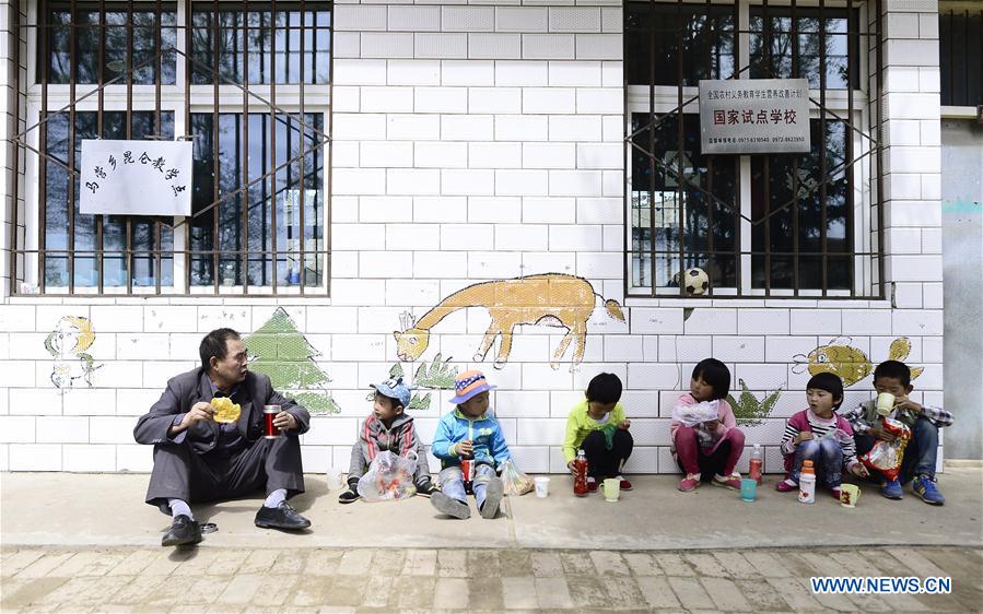 The 56-year-old teacher Hua Fulin (L), the only teacher of the small school in Kunlun Village, eats lunch with his students in Kunlun Village of Haidong City, northwest China's Qinghai Province, Sept. 8, 2016. About 50 kilometers away from the nearest county, the Kunlun small school now has only eight students and one teacher. (Xinhua/Zhang Hongxiang)