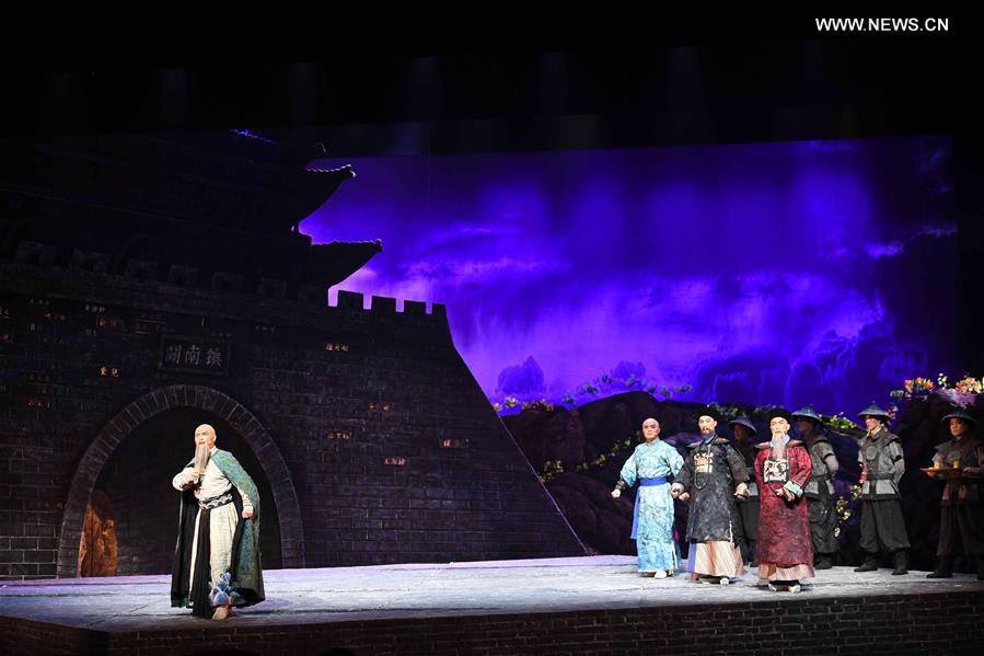 Actors perform during the Zhuang ethnic Drama "Feng Zicai" in Beijing, capital of China, Sept. 9, 2016. The drama eulogizes the Chinese hero Feng Zicai leading his force defending against the invading French army during China's Qing Dynasty(1644-1911). (Xinhua/Chen Yehua)